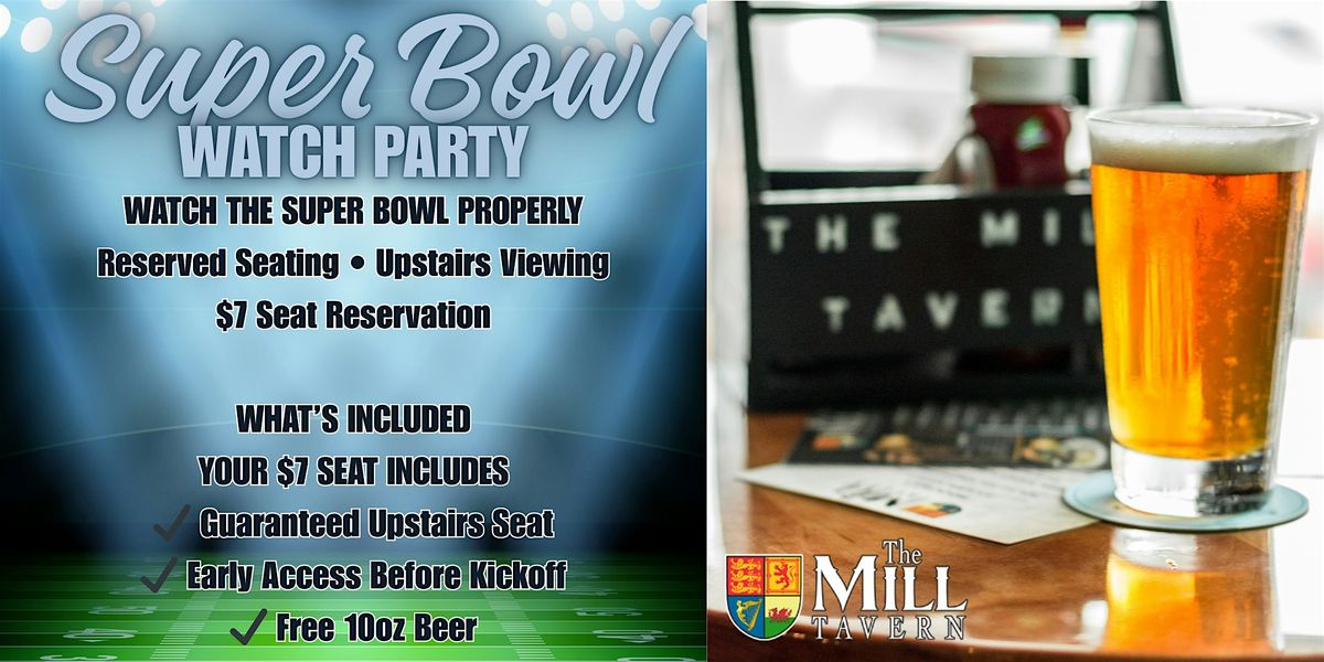 This is a ticketed, reserved-seating Super Bowl viewing with big screens, event-only drink pricing, and complimentary prize giveaways throughout the game.