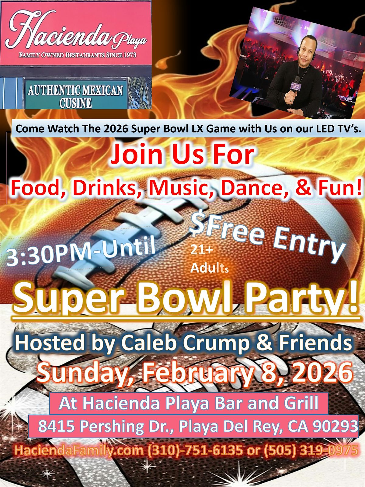 Grab your Friends, Family, Co-Workers, and Neighbors, and Join us on Super Bowl Sunday, February 8, 2026 from 3:30 PM- Until, for a Fun Super Bowl Watch Party at Hacienda Playa Bar and Grill Authentic Mexican Cuisine Restaurant located at 8415 Pershing Drive in Playa Del Rey, California 90293 (By Pershing Drive and Manchester).