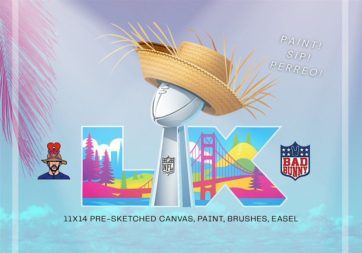 🎨 WHAT YOU’LL PAINT:A special, custom-designed canvas celebrating Bad Bunny’s iconic style and Super Bowl spirit!