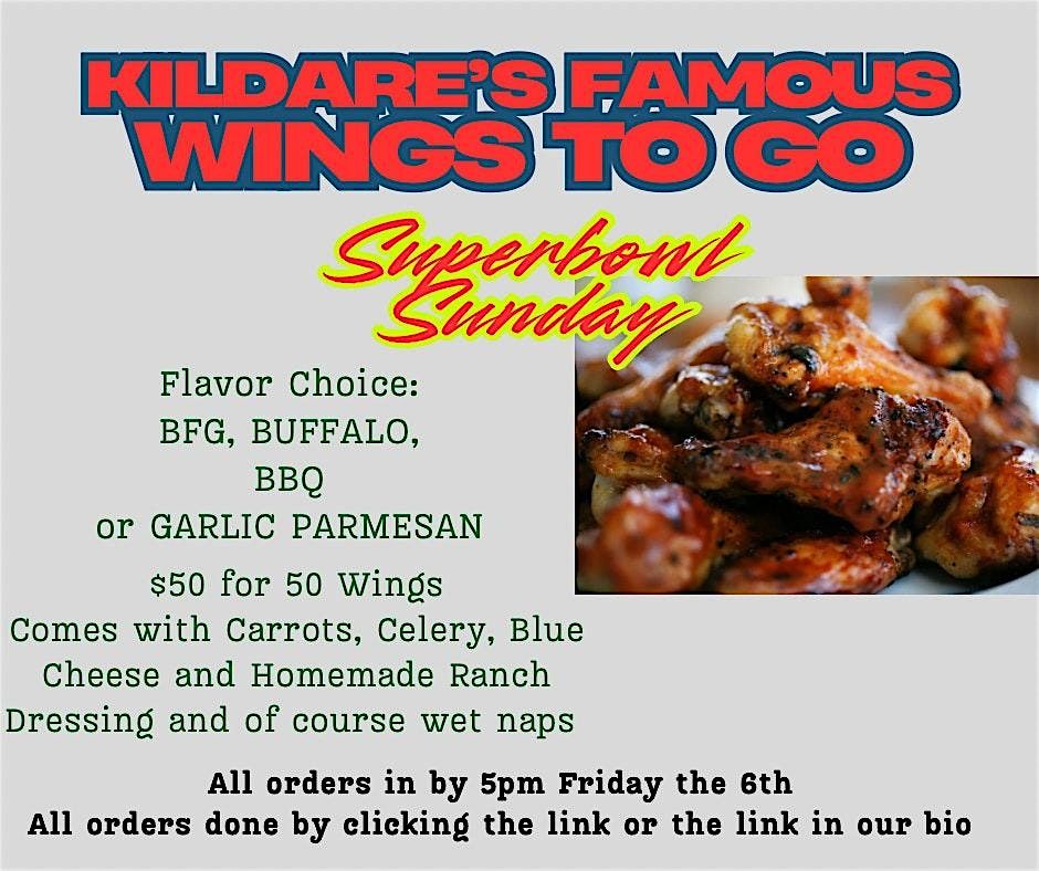 Are you having a party for the biggest game of the year? Our famous wings to go are just what you need. Choose From BFG, Buffalo, Whiskey BBQ or Garlic Parmesan. 50 wings $50. Comes with Homemade Ranch and Blue Cheese, Carrots and Celery. Orders must be in by Friday at 3pm