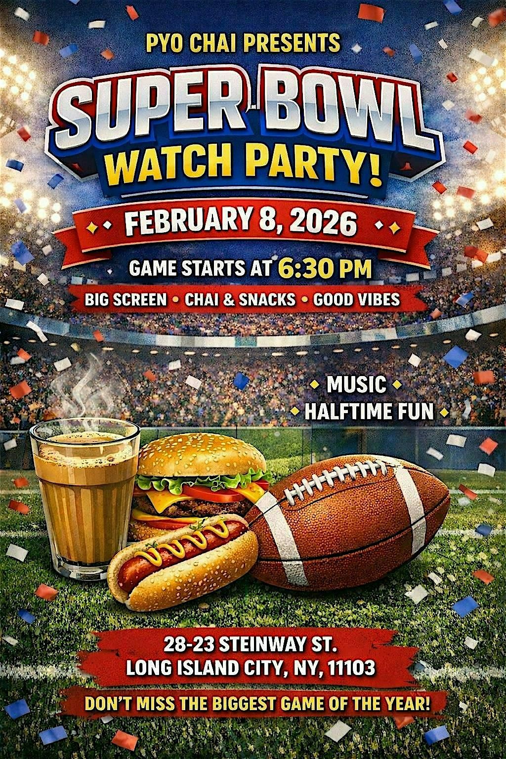 Get ready for Superbowl at PYO Chai! Get ready for an epic night of football at PYO Chai on February 8, 2026 at 6:00 PM (Eastern Time). Join us for an evening filled with touchdowns, cheers, and delicious burgers, hot dogs, bubble teas, momos and snacks. Whether you're rooting for your favorite team or just here for the commercials, this event is sure to be a blast! Don't miss out on the excitement - mark your calendars and invite your friends. See you there!