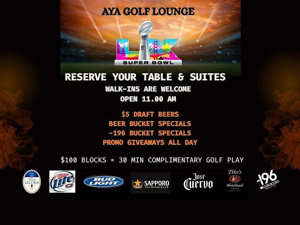 Welcome to SUPERBOWL @ AYA GOLF LOUNGE happening at 641 Ke’eaumoku St on February 8, 2026 at 11:00 AM. Get ready for an epic day filled with football, fun, and fantastic vibes! Join us for a thrilling Superbowl experience with friends and fellow fans. Let's cheer on our favorite teams, enjoy great food, and make unforgettable memories together. Don't miss out on this exciting event!