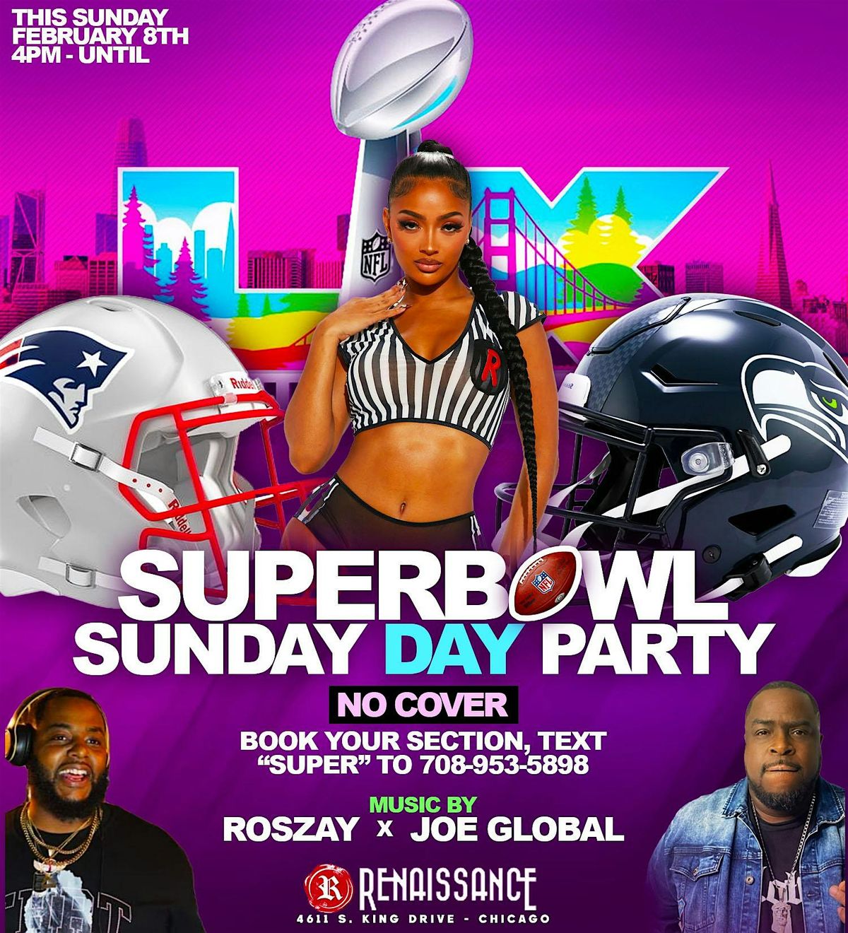 SUPERBOWL DAY PARTY AND WATCH PARTY!! 4PM - UNTIL. RENAISSANCE!! NO COVER! GREAT MUSIC!! TEXT "SUPER" TO 708-953-5898 FOR SECTIONS!About this Event