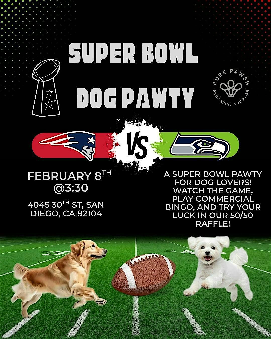 Join us at Pure Pawsh for a Super Bowl Dog Pawty on February 8th at 3:30 p.m.
