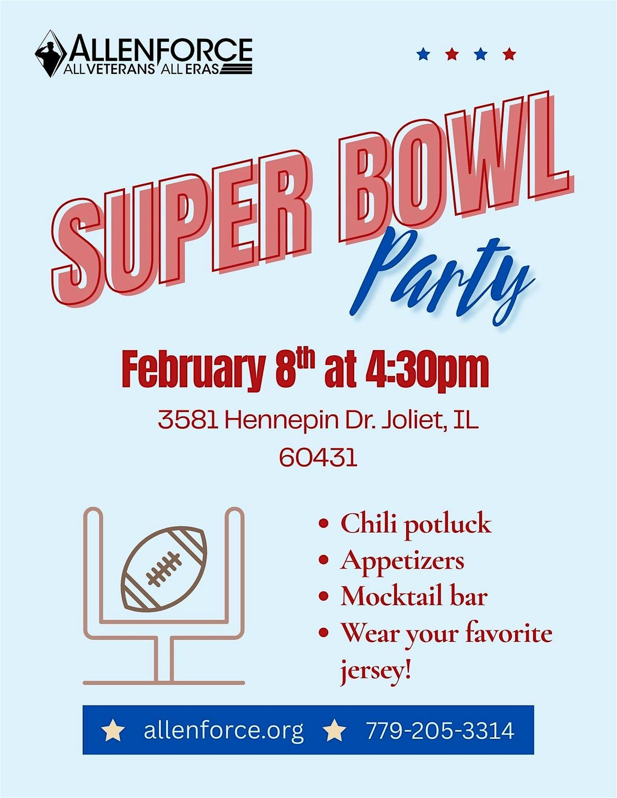 Join us for an AllenForce Super Bowl Party filled with game day fun, connection, and good food. Enjoy a chili potluck with appetizers provided. Bring your favorite chili to share if you’d like. Wear your favorite jersey and come cheer, eat, and hang out together!