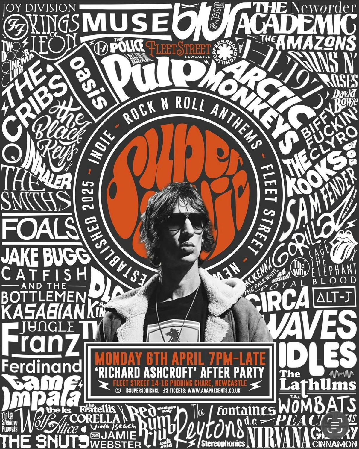 SUPERSONIC "Richard Ashcroft Pre & Afterparty"ANYTHING WITH QUESTION MARK IS TBC// NICK TO CHECK GRAMMA AND SPELLING 📍 Fleet Street, Newcastle🗓 Monday 06 April 2026🕖 5PM – 1:AM 🎟 Free tickets available now!🍻 Discounted drinks for ticket holdersFresh off the back off a sold out Oasis tour, lead singer of The Verve Richard Ashcroft return's to the Toon at a packed out Utilita Arena. Expect a night full of indie bangers, cult classics and rock 'n' roll anthems from The Verve/Richard Ashcroft (of course), Oasis, Artic Monkeys, Stone Roses, Blur, Kasabian, The Smiths, Pulp and loads more.Newcastle's new home of indie is calling, Join us before and after the gig for wall-to-wall tunes, unbeatable vibes and discounted drinks for ticket holders.Contact: [email protected]Disclaimer: