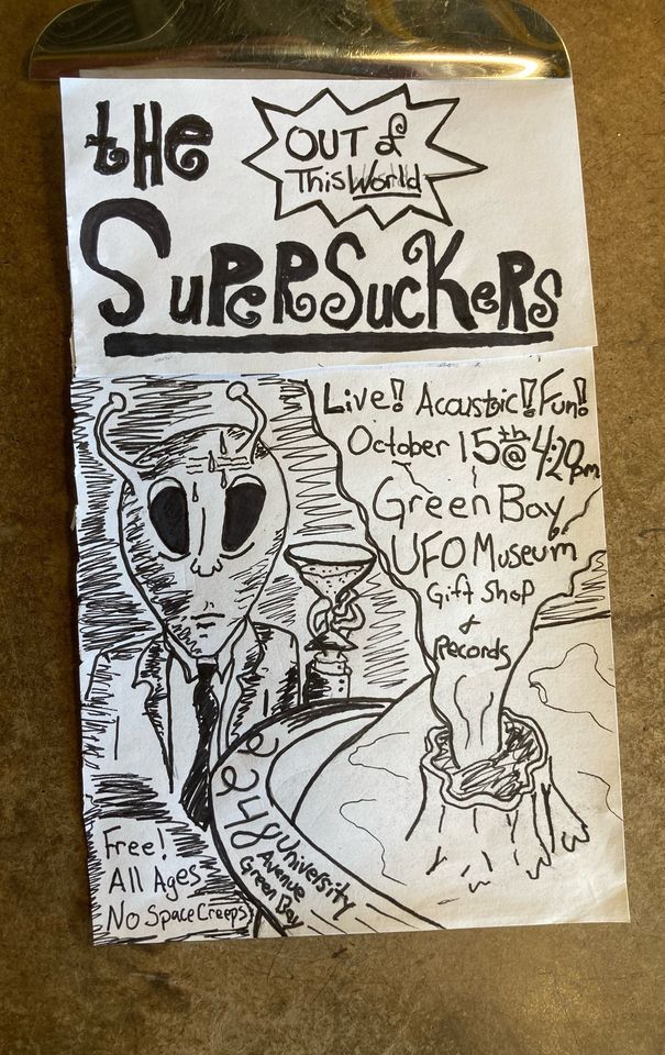 The World's Greatest Rock N Roll Band the Supersuckers is gracing the Green Bay UFO Museum Gift Shop and Records with their presence for a mini-acoustic performance Saturday October 15 at 4:20pm. This event is free and all ages. The Supersuckers will also be playing later that evening at The Lyric Room at The Lyric Room(233 N. Broadway Green Bay WI). This is the first ever in store performance at the Green Bay UFO Museum Gift Shop and Records and we couldn't be more ecstatic about it being the Supersuckers a band Green Bay has had a love affair with since their first show at Kutska's Hall.