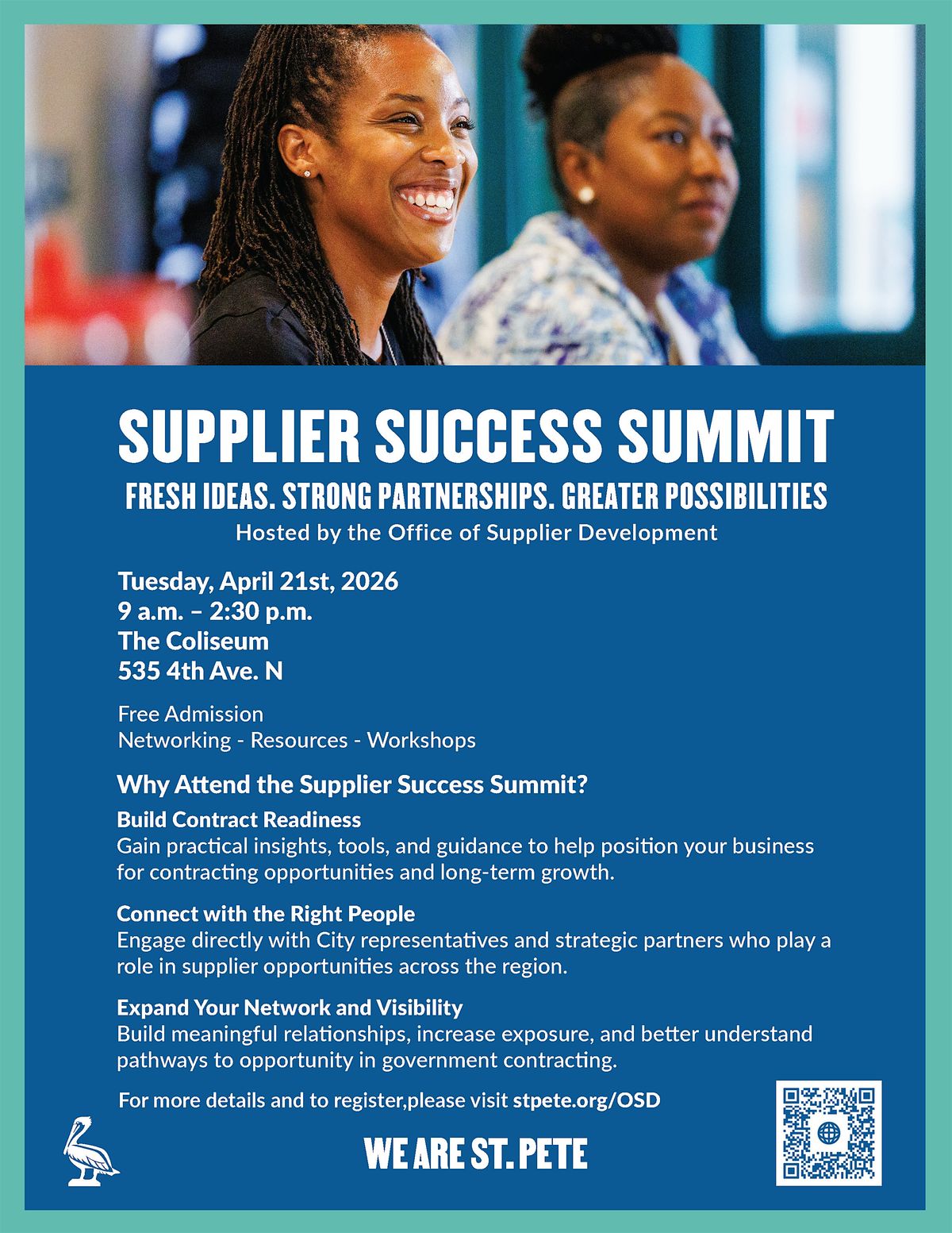 The Supplier Success Summit is a FREE annual event hosted by the City of St. Petersburg. It is a unique opportunity to meet resource providers and stakeholders with contract opportunities while also spending the day in business focused seminars and panel discussions on relevant topics. This year we have 15 different breakout session topics, 3 panel discussions, and 1 keynote speech being delivered by Bemetra Simmons - President and CEO of Tampa Bay Partnership.