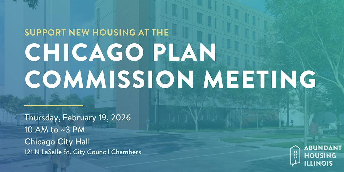 Join us on Thursday, February 19, to attend this month's Chicago Plan Commission meeting and speak in favor of more housing! Abundant Housing Illlinois + Strong Towns Chicago advocates are encouraged to provide public comment, and our Super Volunteers are happy to assist with helping you draft and prepare a script if you've never spoken at a public meeting.