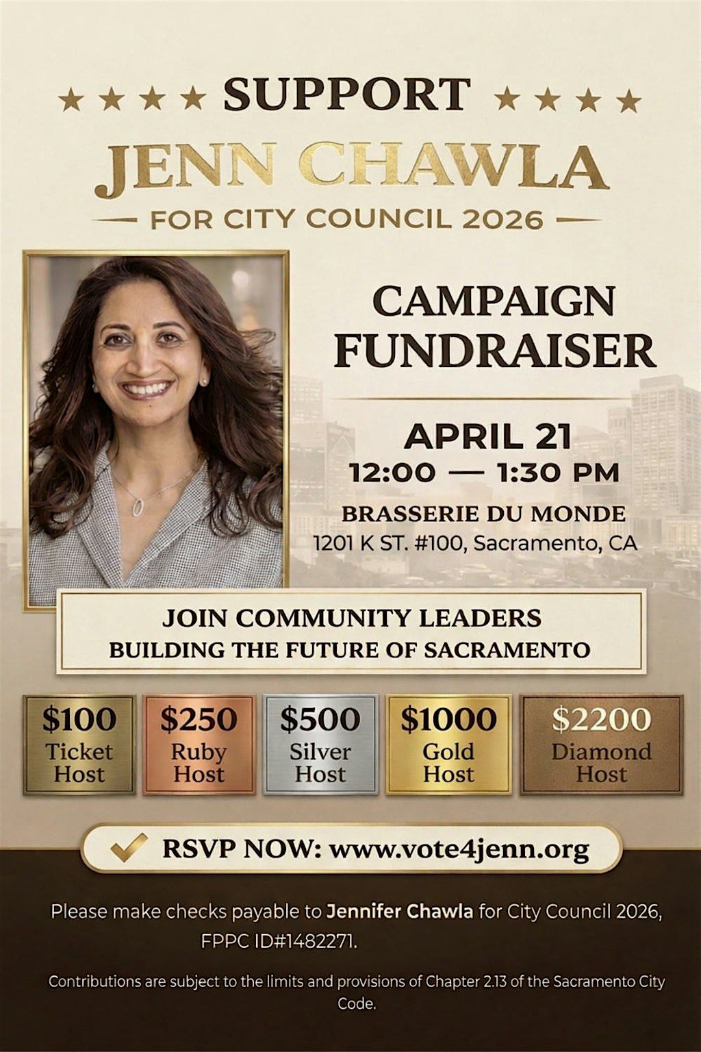 Support Jenn Chawla for City Council 2026! Join community leaders in Sacramento to connect, contribute, and shape the future.