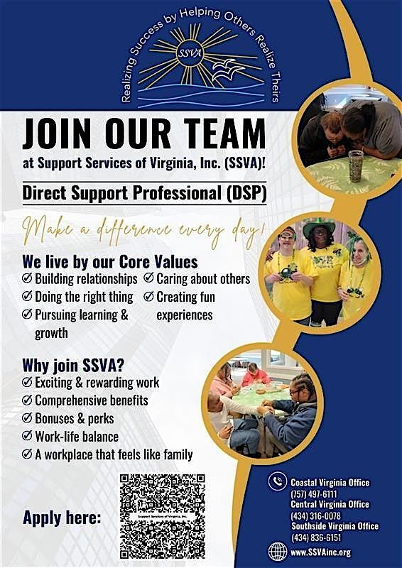 Are you passionate about helping others live their best lives? Come join our hiring event at the Hampton Roads location near Mt. Trashmore! Meet with our team and learn about the exciting opportunities for Direct Support Professionial's . Whether you're experienced in the field or just starting out, we want to meet you! Don't miss this chance to take the next step in your career.