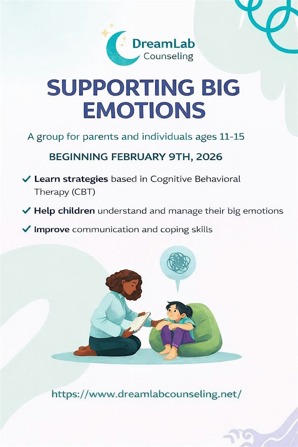 Supporting Big Emotions is a skills-based group designed for adolescents ages 11–15 and their caregivers. This program provides a supportive and structured environment where participants will learn practical strategies to identify, express, and manage intense emotions using Cognitive Behavioral Therapy (CBT)–informed techniques. The group is structured into two concurrent tracks: one group for adolescents and a separate group for caregivers. Adolescents will focus on building emotional awareness, coping skills, and healthy communication, while caregivers will learn effective strategies to support their child’s emotional regulation and skill development at home. Together, both groups work toward strengthening understanding, communication, and emotional resilience.