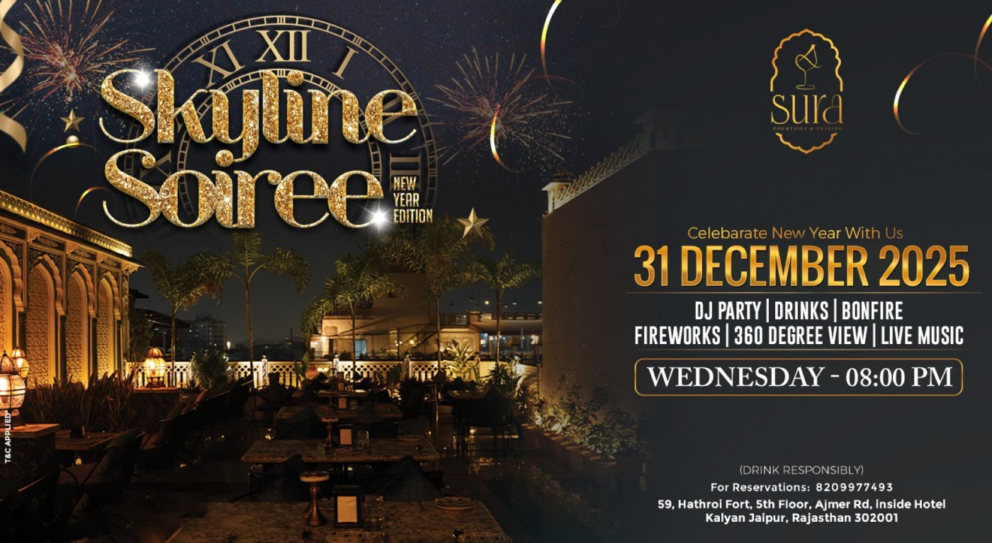 Ring in the new year party SURA SKYLINE SOIREE with Sura -Cocktails & Cuisine , Kalyan Restaurant and Bar and Kalyan Hotels !! Join us at our rooftop restaurant and bar for DJ,LIVE MUSIC, Alcohol , Drinks, Bonfire, Fireworks ,360 Degree View New Year Party @ Sura - Kalyan Hotels Jaipur.
