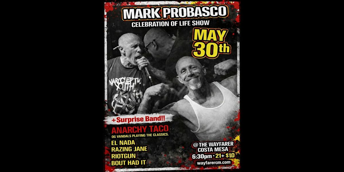 Mark Probasco Celebration of Life Show feat Special Guests with Anarchy Taco (OG Vandals Playing The Classics), El Nada, Razing Jane, Riotgun, Bout Had It on Saturday, May 30 at The Wayfarer in Costa Mesa, CA!