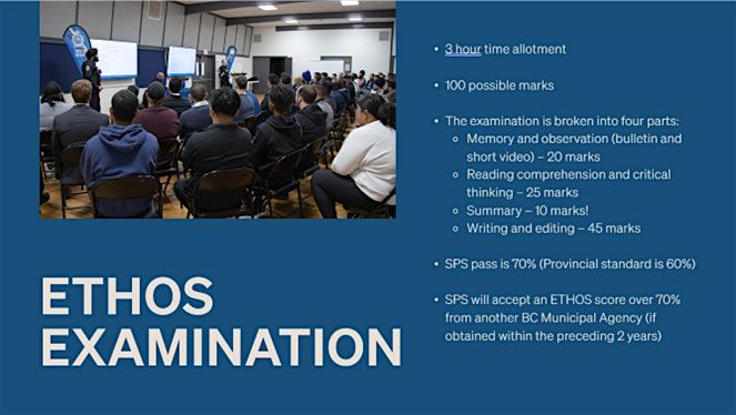 Write the Surrey Police Service entrance exam that can be attached to your application package, when you decide to apply. Valid for 2 years.