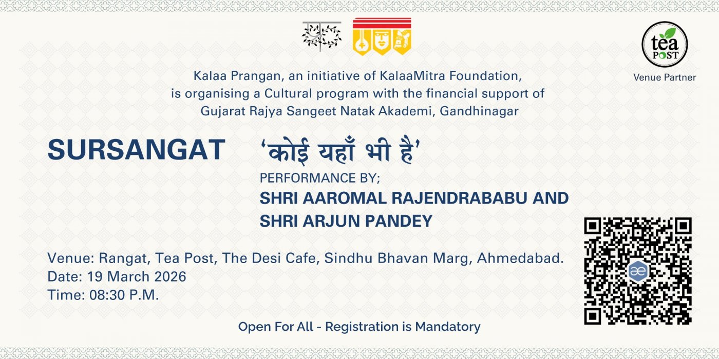Kalaa Prangan (an initiative of KalaaMitra Foundation), with the financial support of the Gujarat Rajya Sangeet Natak Akademi, Gandhinagar, invites you to a soulful cultural evening.