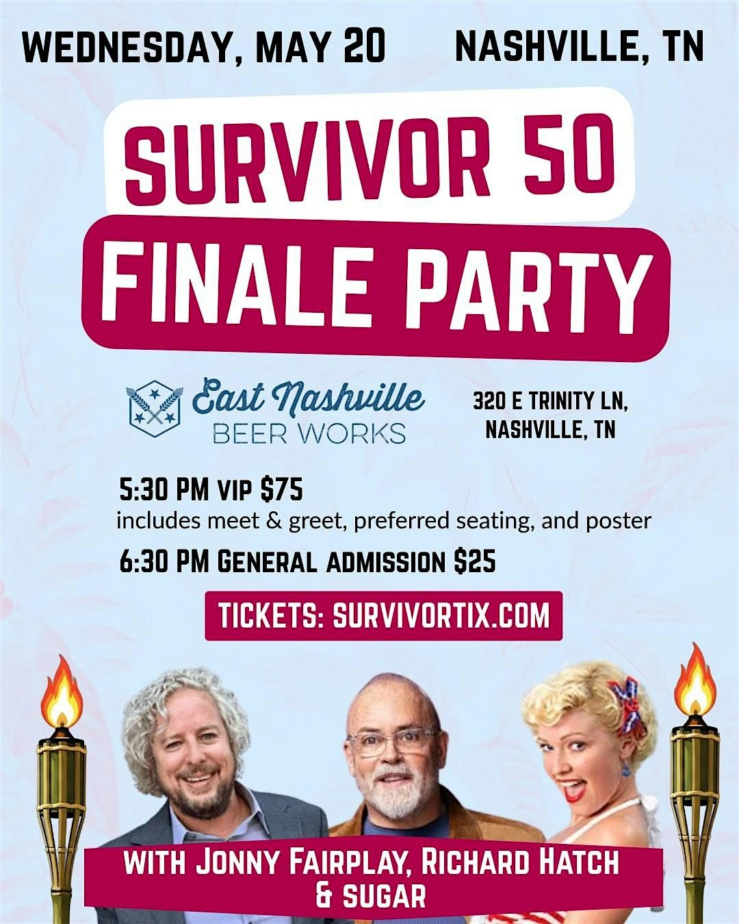 Join Dead Grandma Lie Jonny Fairplay ,First Survivor Winner Richard Hatch & Survivor Gabon's Sugar Kiper for a LIVE Survivor Season 50 Finale Viewing Party - Nashville Tennessee. VIP is $75 includes 5:30-6:30 meet and greet, and personalized autographed 8.5x11 Richard Hatch and Jonny Fairplay poster. Ultra VIP is $125 also includes Robbed Icons SIGNED t-shirt AND First Boot Legends SIGNED t-shirts AND SIGNED Sugar Poster! General admission is only $25 and begins at 6:30. Additional Castaways tentatively scheduled to appear.