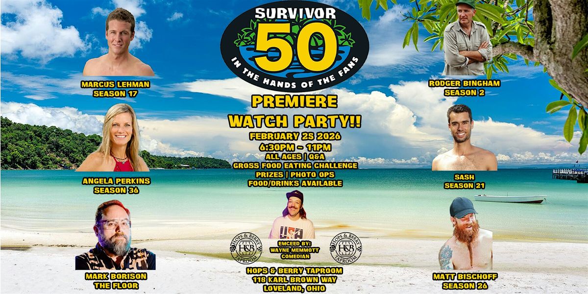 Get ready for the once in a lifetime Survivor 50 Premiere Viewing Party! Join us in person Wednesday Feruary 25th in Loveland, Ohio at Hops and Berry Taproom. Watch Survivor with former Survivor Cast members. Matt Bischoff from Survivor Caramoan, Rodger Bingham from Survivor Australian Outback, Angela Perkins from Survivor Ghost Island, Marcus Lehman from Survivor Gabon and Matthew "Sash" Lenahan from Survivor Nicaragua. Also Mark Borison from The Floor/Jungle Jims Podcast and Emceed by Cincinnati Stand up Comedian Wayne Memmott! This is an all ages event and seating is limited so be sure to reserve your tickets to guarantee a seat.