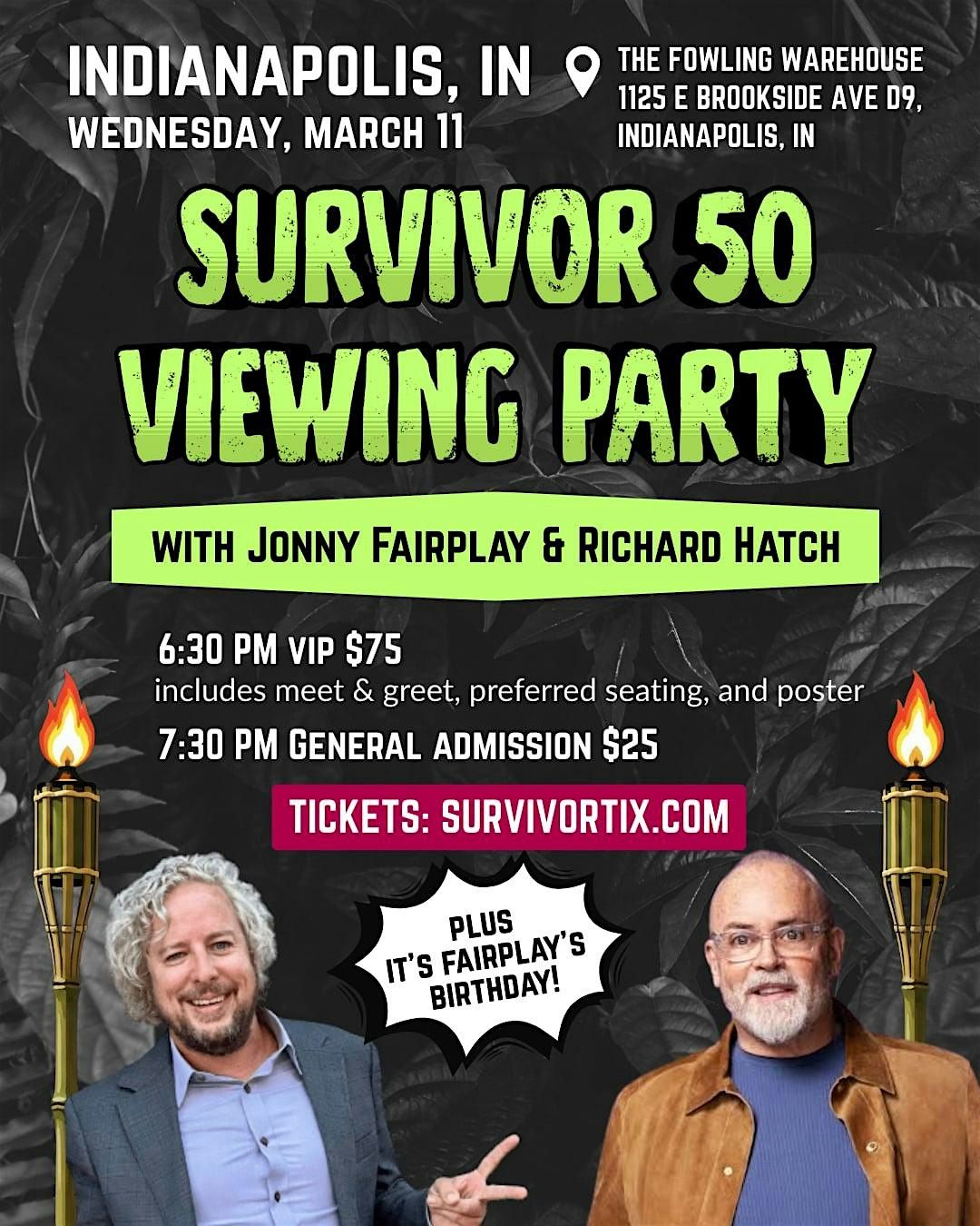 Join Dead Grandma Lie Jonny Fairplay & First Survivor Winner Richard Hatch for a LIVE Survivor Season 50 Viewing Party - The Fowling Warehouse Indianapolis Indiana. VIP is $75 includes 6:30-7:30 meet and greet, and personalized autographed 8.5x11 Richard Hatch and Jonny Fairplay poster. General admission is only $25.