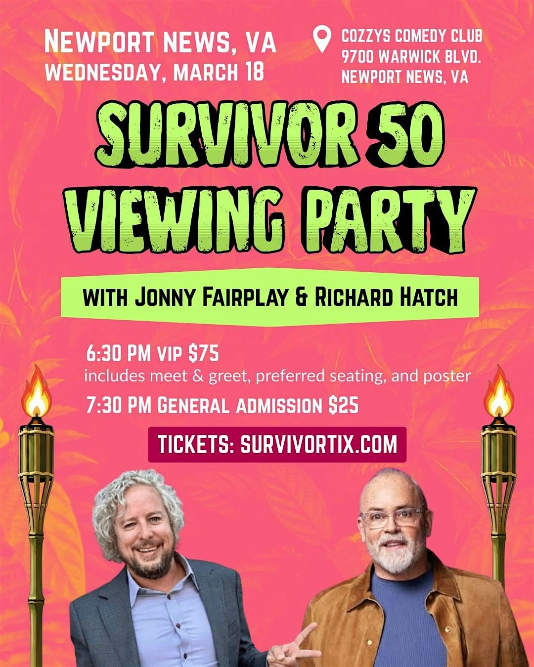Join Dead Grandma Lie Jonny Fairplay & First Survivor Winner Richard Hatch for a LIVE Survivor Season 50 Viewing Party - Newport News VA. VIP is $75 includes 6:30-7:30 meet and greet, and personalized autographed 8.5x11 Richard Hatch and Jonny Fairplay poster. General admission is only $25. Additional Castaways tentatively scheduled to appear.