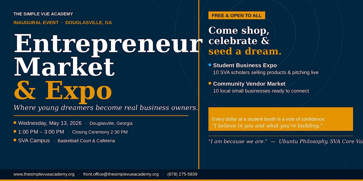 The Simple Vue Academy's Inaugural Entrepreneurship Market & Expo is a full community celebration of student ingenuity, African heritage, and the village it takes to raise young entrepreneurs. Our 6th and 7th grade scholars have been working hard — really hard — to build real businesses from the ground up. On May 13th, they open their doors to the world.
