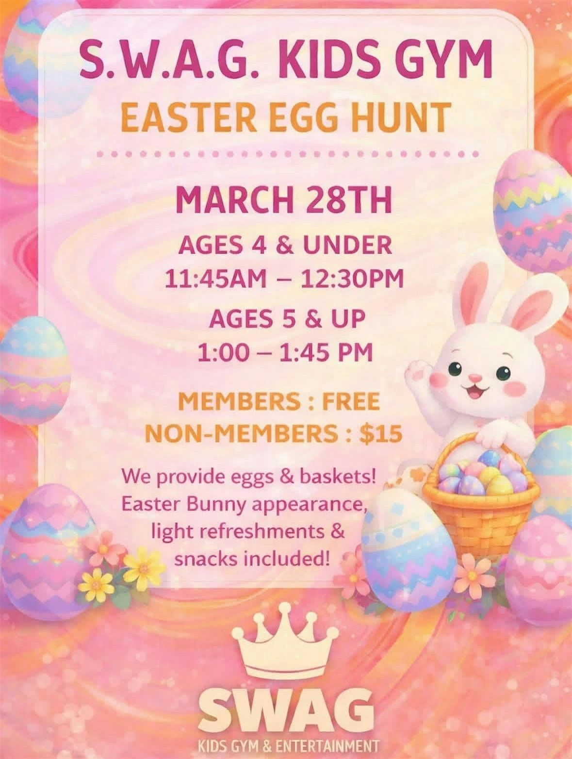 Join us for a super fun in-person Easter Egg Hunt just for the little ones! If your kiddo is 4 years old or younger, they’re invited to hop on over to SWAG Kids Gym and search high and low for colorful eggs filled with surprises.