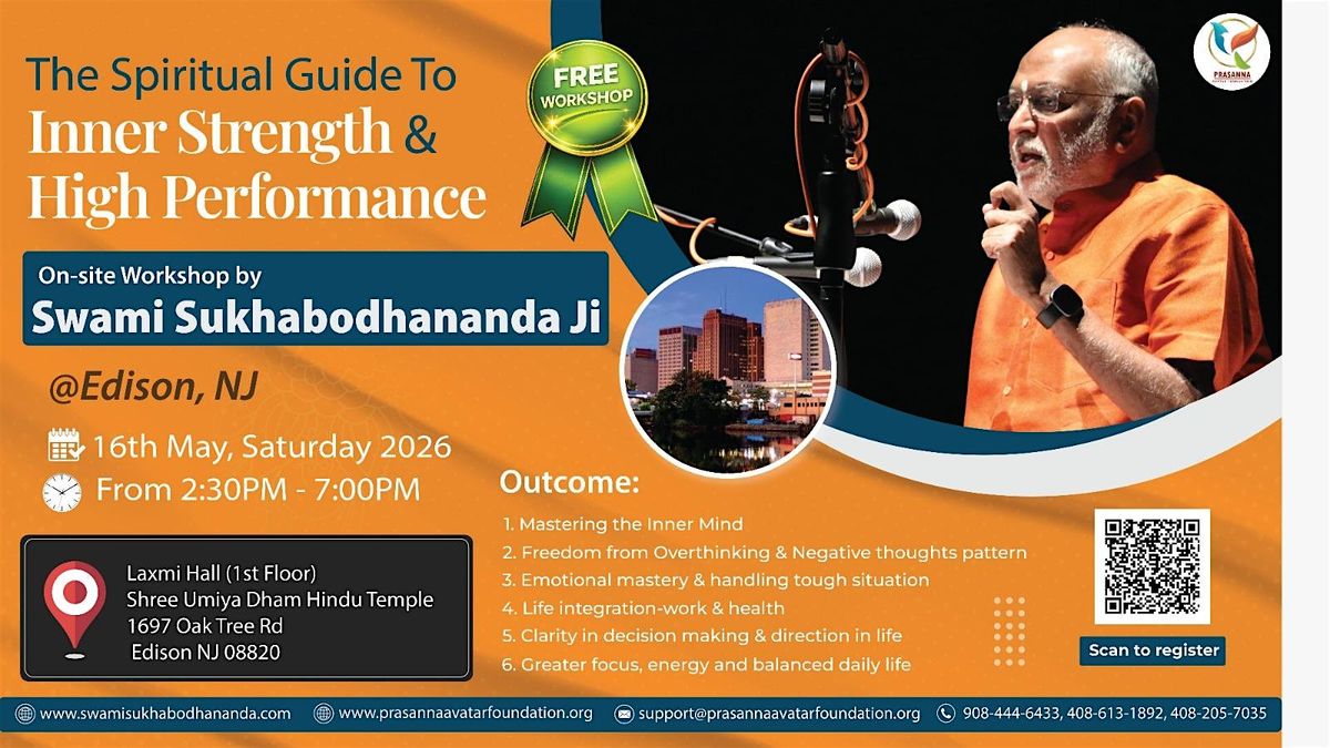 Free workshop by Swami Sukhabodhananda Ji on inner strength, clarity & stress relief. Edison, NJ | May 16, 2:30–7 PM.
