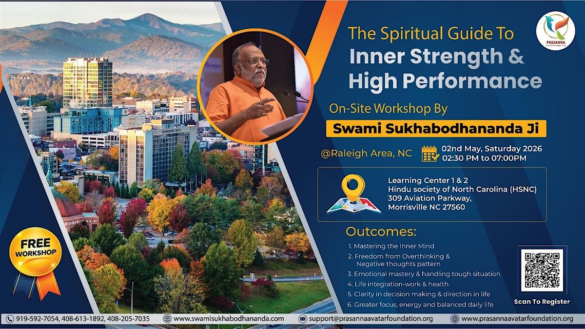 This on-site workshop, led by Swami Sukhabodhananda Ji, is designed to help individuals cultivate inner strength while enhancing personal and professional performance. Set in the Raleigh area, North Carolina, the session blends spiritual wisdom with practical tools to address modern-day challenges such as stress, overthinking, and lack of clarity.