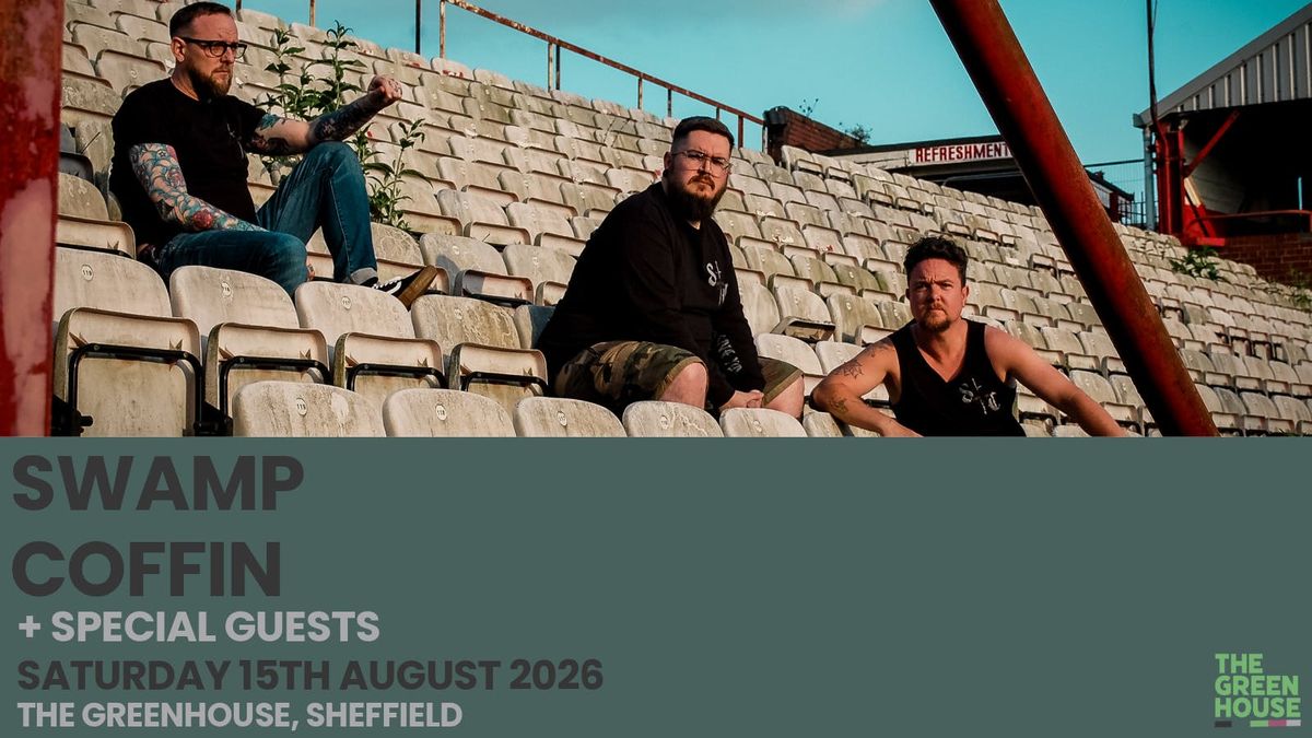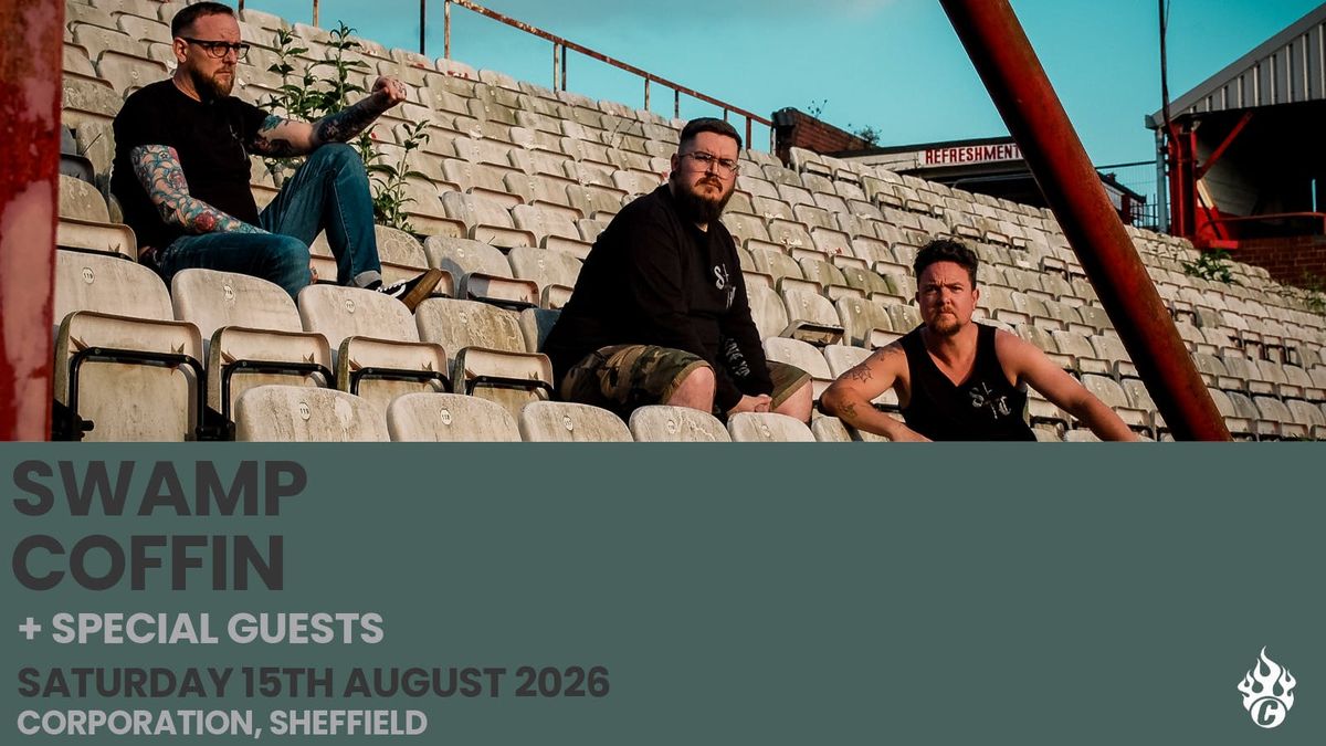 For almost a decade, Swamp Coffin, Rotherham's kings of nihilistic sludge metal, have built a reputation on neck shattering riffs, heavier lyrics and a crushing live show.With 2024 album Drowning Glory featuring in numerous end of year Best Of lists and gaining Radio 1 airplay with the single This Was Always Going To End In War, the architects of The World's Slowest Wall Of Death have been recruiting more members to The Bastard Club than ever before.