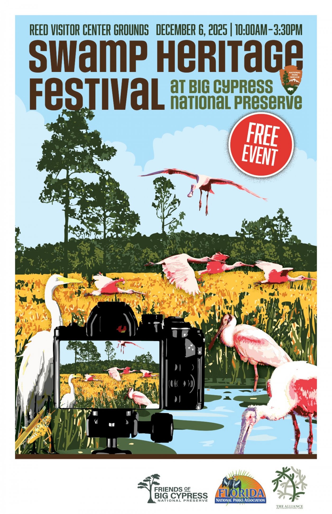 Taking place on December 6th the 2025 Swamp Heritage Festival celebrates Big Cypress National Preserve while also highlighting the thousands of years of inhabitants that preceded and protected this area before it was formally set aside. This year we hope to inspire visitors to see Big Cypress as a place where ‘Art Meets the Wild’. Through artistic talks cultural demonstrations thrilling stories and hands-on activities we will explore the ways in which people have found endless inspiration in the swamp. We strive to provide opportunities to learn about the difference lens’s that people look through to see Big Cypress National Preserve. In 2025 we hope to show that Big Cypress is a place of wild wonder and awe that just may inspire you too!