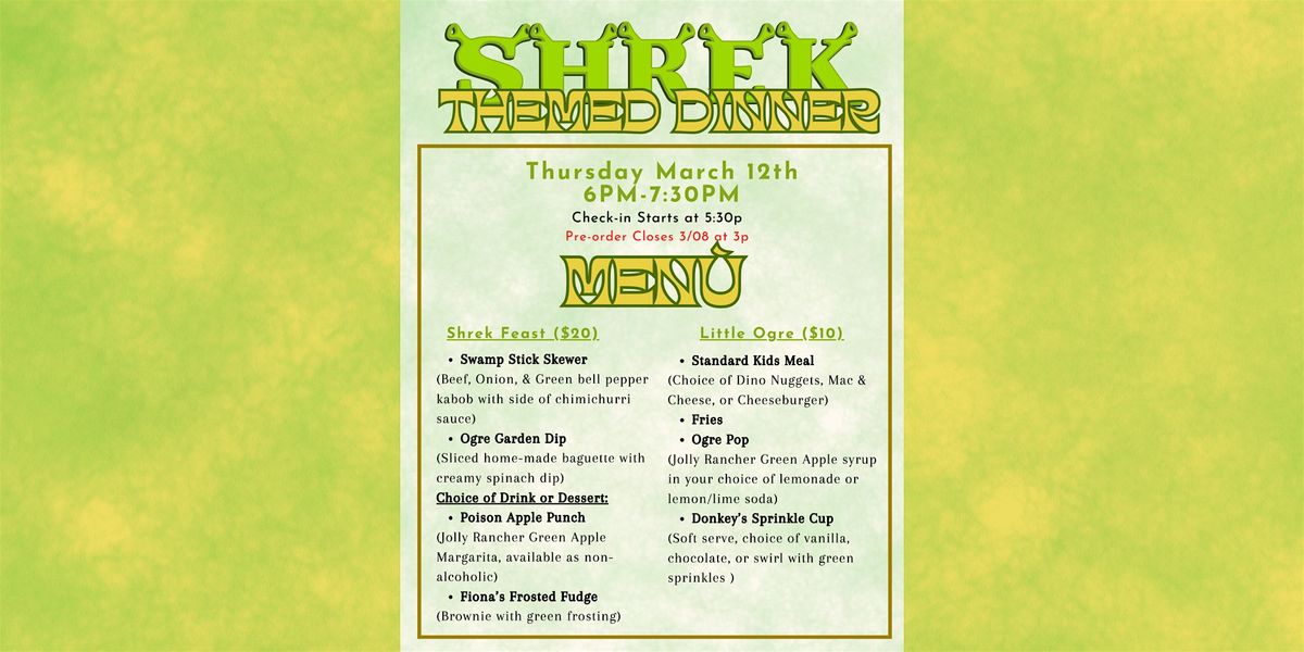 Get out of my swamp… and into your seat! Join us for a one-of-a-kind Ogre themed dinner experience featuring a swamp-inspired menu and a showing of a beloved animated classic.