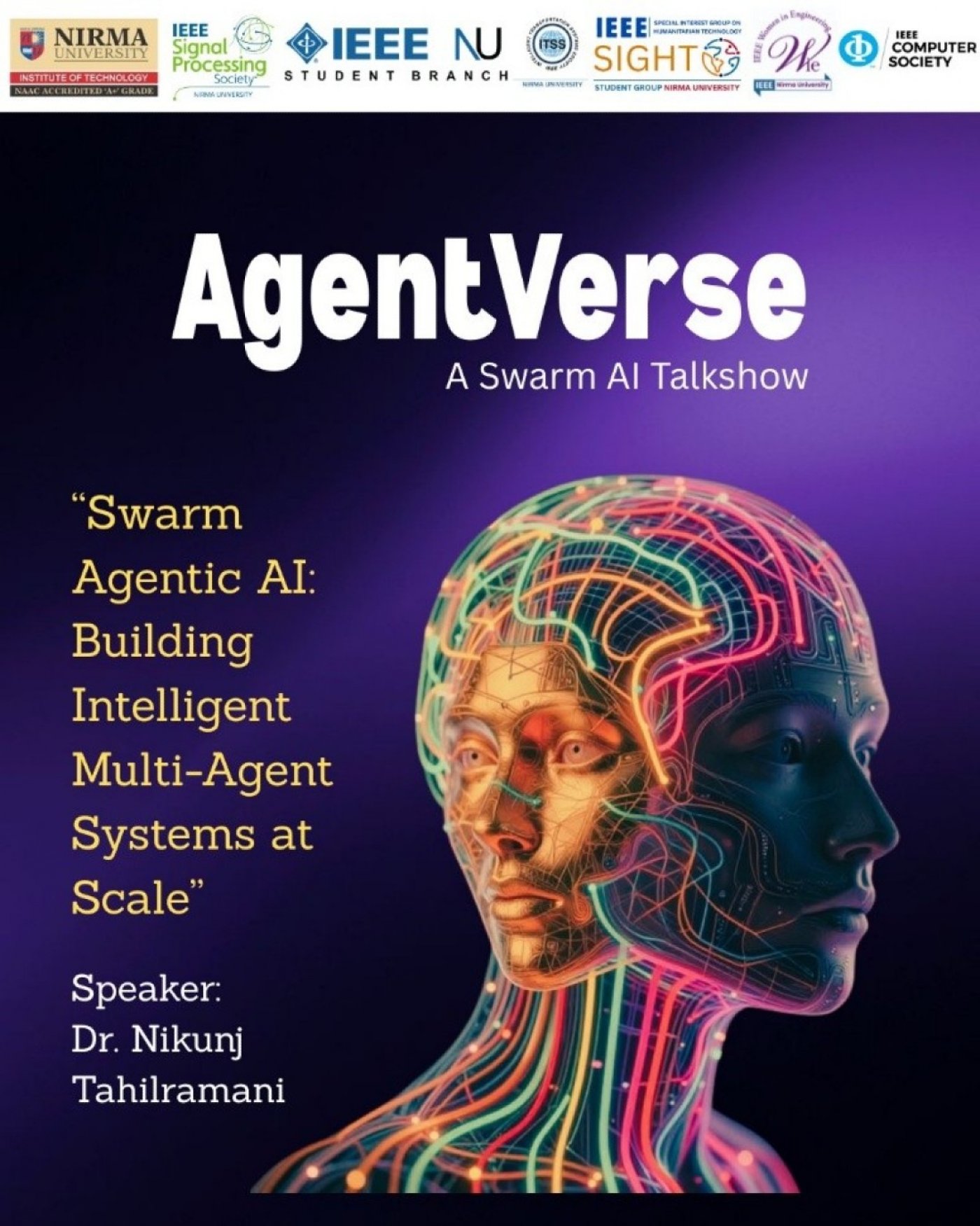 AgentVerse: A Swarm AI Talkshow is an expert-led technical session hosted by the IEEE Signal Processing Society at Nirma University. The event focuses on the intersection of swarm intelligence and Agentic AI, exploring how to architect decentralized, intelligent multi-agent systems that can solve complex problems at scale.