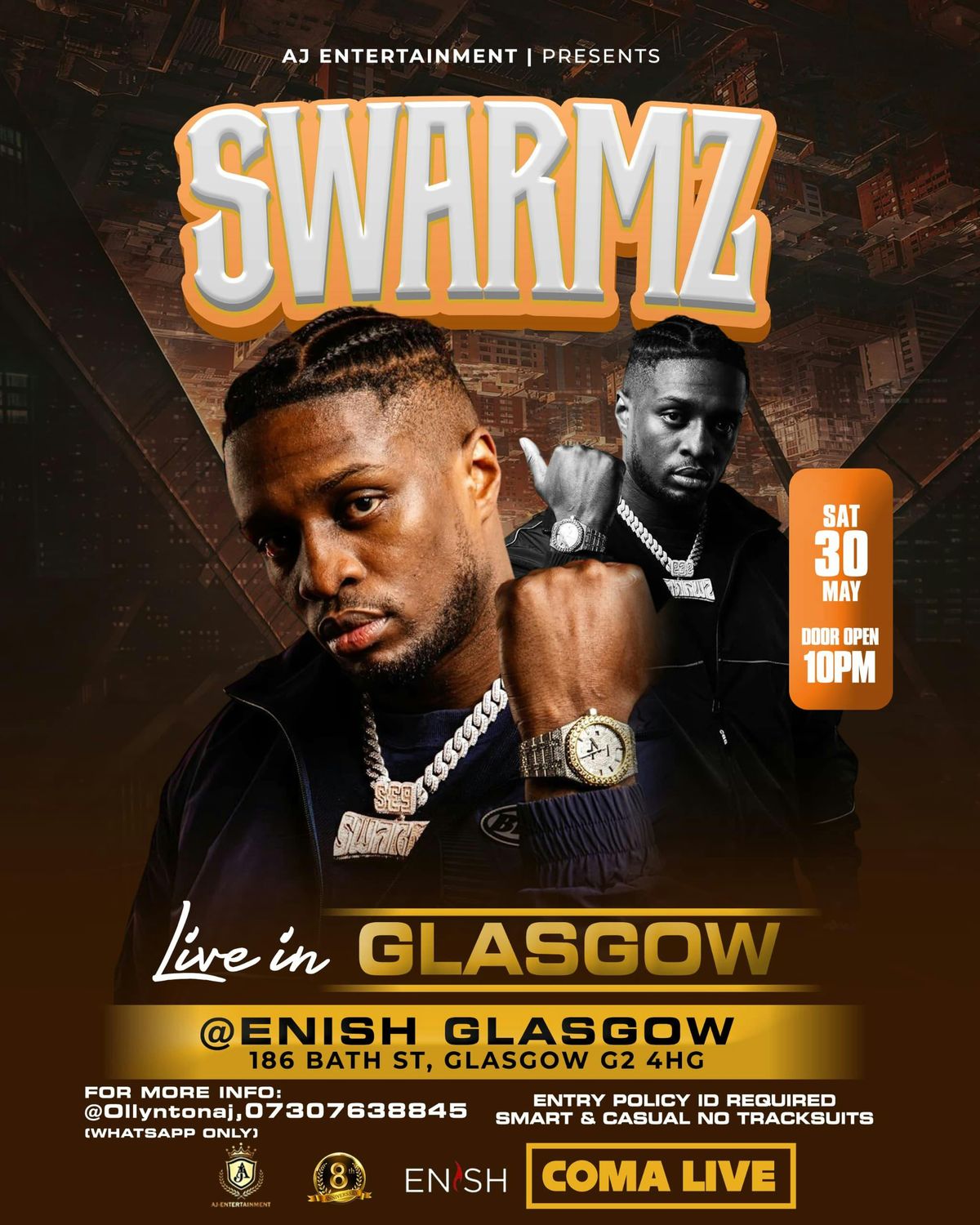 Uk top AFRO-BASHMENT ARTIST ALONGSIDE AFRO SWING LIVE IN GLASGOW FOR THE 1ST TIME. bringing you all the South London Energy to Glasgow City so dont waste time tell a friend to inform another friend that SWARMZ LIVE @ ENISH GLASGOW BY AJ ENTERTAINMENT GROUP