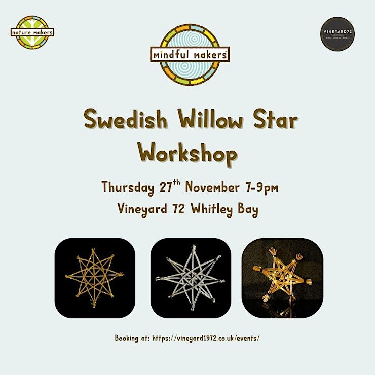 Join us at Vineyard72 Whitley Bay for a festive willow star workshop. Make your own woven willow star complete with fairy lights with guidance from Katherine from nature makers