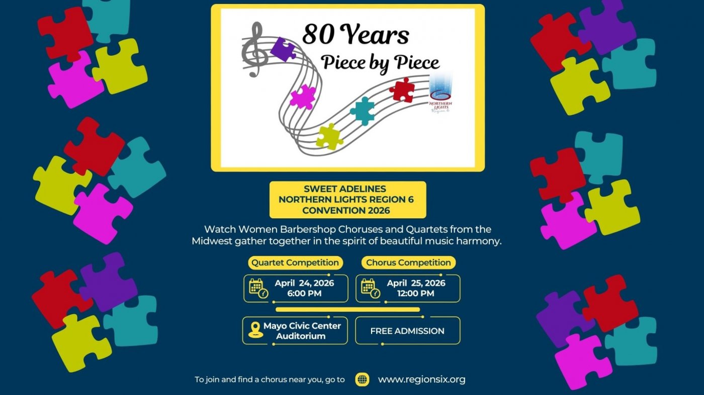 Every year, choruses and quartets from Region 6 gather together for Convention and Competition. We have been doing this spectacular event and we are not able to keep it to ourselves anymore, especially because we are celebrating our 80th year! We are hoping that you will come and help us share what our organization does and how we impact the community through singing. In fact, "Harmonize the World" is our motto.