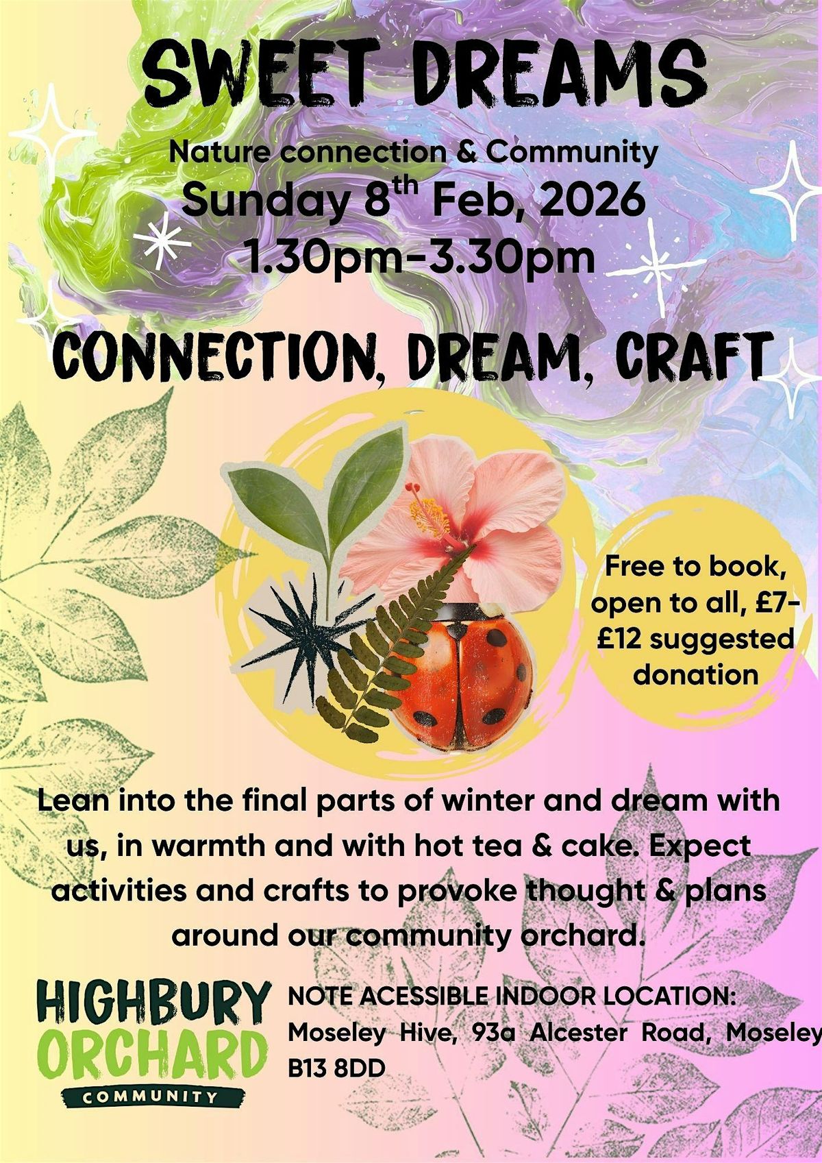 Join us for a cosy Indoor Winter Dream Session at Moseley Hive, a gentle, reflective space to pause, dream, and imagine what the changing season might bring. As winter begins to soften, we’ll gather our thoughts and explore our hopes and dreams through arts and crafts, inspired by nature, community, and our shared spaces at Highbury Orchard.