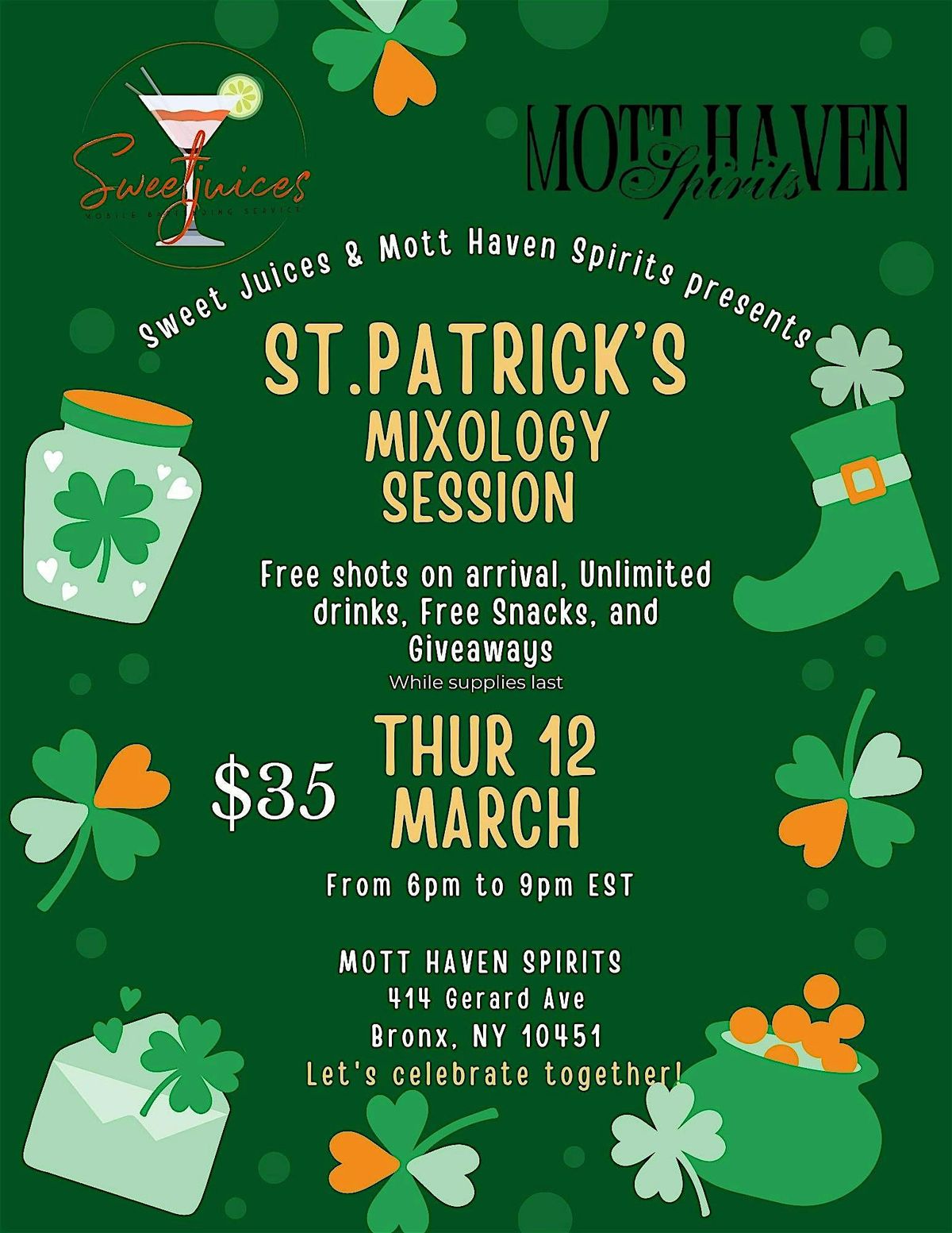 Sweet Juices & Mott Haven Spirits St Patrick's Day Mixology Session