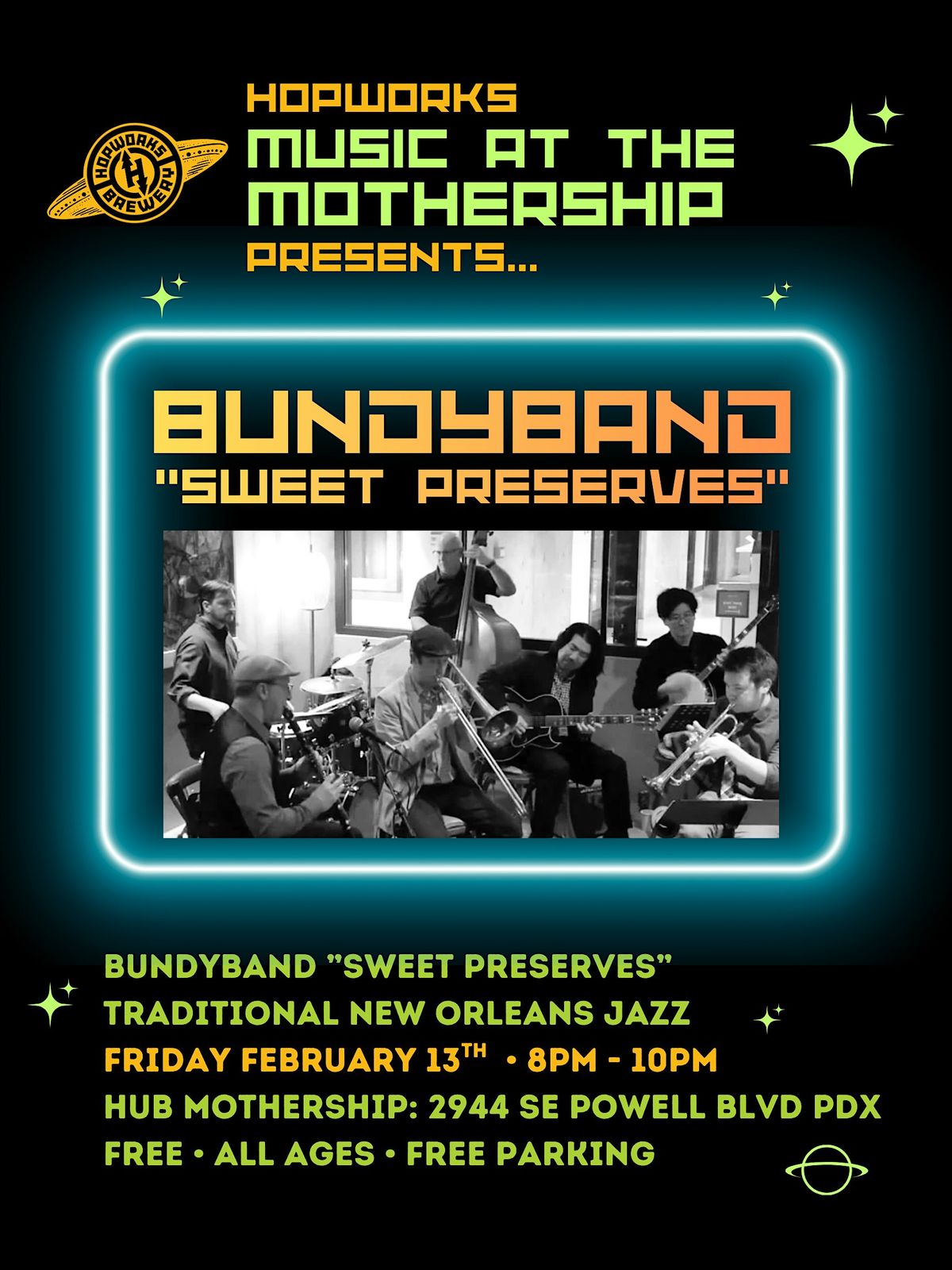 The BundyBand Sweet Preserves are back at the Hopworks Mothership! We'll move some tables and get dancing right around 8PM. Be ready for guest sit ins and craziness as this is also a birthday hang for bandleader G Douglas Bundy. No presents please, just your presence!