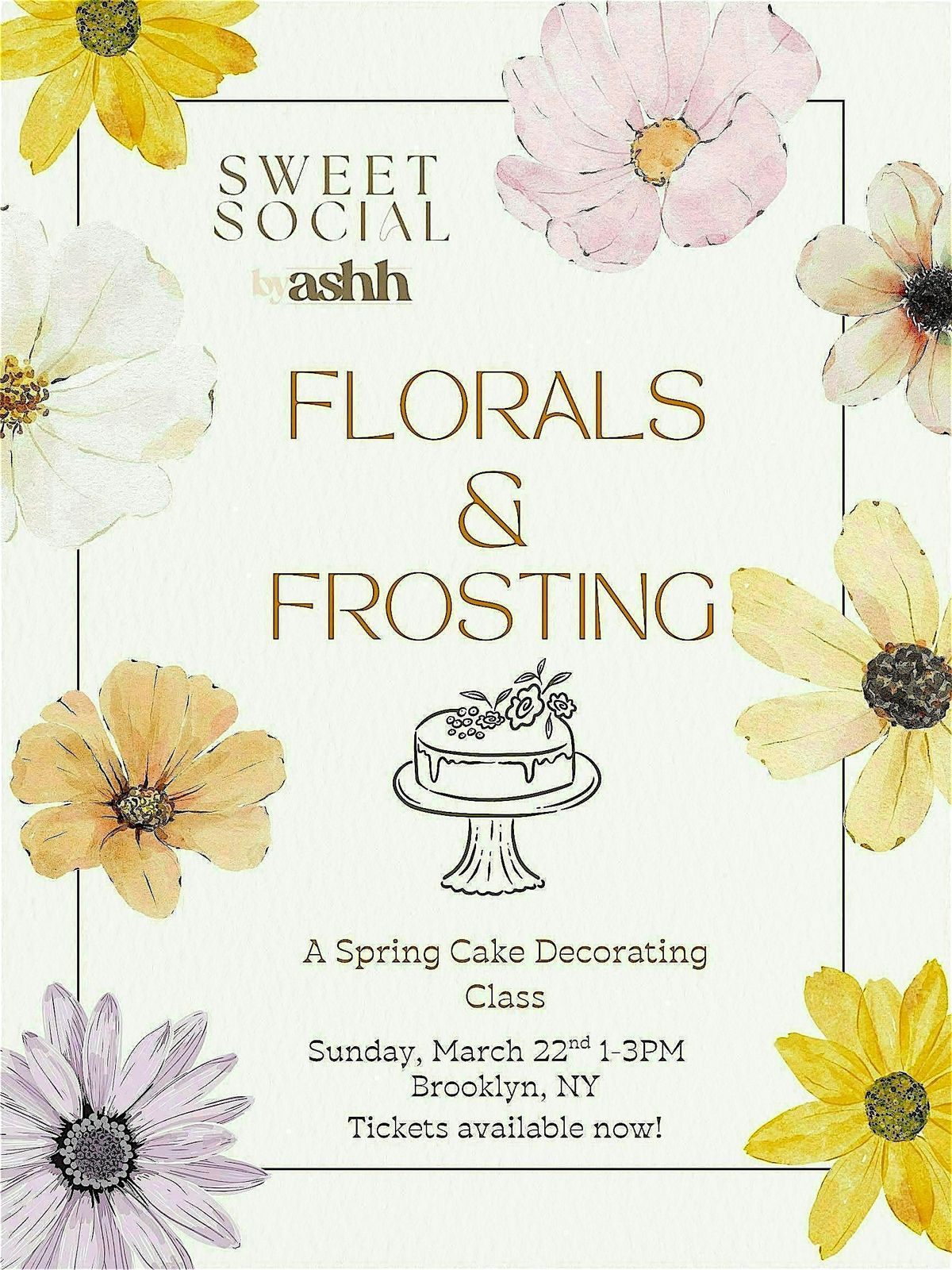 Guests will be guided step-by-step as they decorate their own 5-inch round cake, learning how to smooth buttercream and pipe delicate florals using classic techniques. Expect a fresh spring palette of pastels and ivory, with floral details that bring your cake to life.