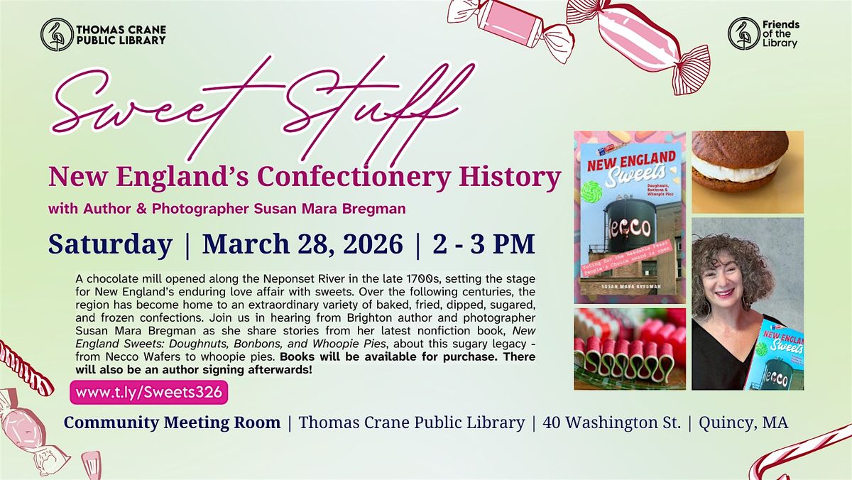 A chocolate mill opened along the Neponset River in the late 1700s, setting the stage for New England’s enduring love affair with sweets. Over the following centuries, the region has become home to an extraordinary variety of baked, fried, dipped, sugared, and frozen confections. In celebration of Women's History Month, join us at the Thomas Crane Public Library for a book talk from Brighton author and photographer Susan Mara Bregman! Susan will share stories from her latest nonfiction book, New England Sweets: Doughnuts, Bonbons, and Whoopie Pies, about this sugary legacy - from Necco Wafers to whoopie pies. Copies will be available for purchase. There will also be an author signing afterwards!