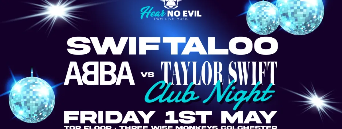 💃✨ Calling all Dancing Queens and Swifties! It’s ABBA vs Taylor Swift — a glitter-soaked, sing-your-heart-out kind of night where disco meets heartbreak anthems. Fancy dress? Totally optional, but why not go full sequins or sparkle era? Grab your friends, hit the floor, and get ready to dance, scream, and maybe cry (in a fun way). Let the battle of the bops begin! Friday 1st May£5 advance (+ booking fee)Doors 8:30pmOver 18s only This gig takes place on the top floor of Three Wise Monkeys Colchester Access – There is no lift to access the top floor of Three Wise Monkeys. There are flights of hand railed stairs to reach the top floor with rest opportunities between each flight