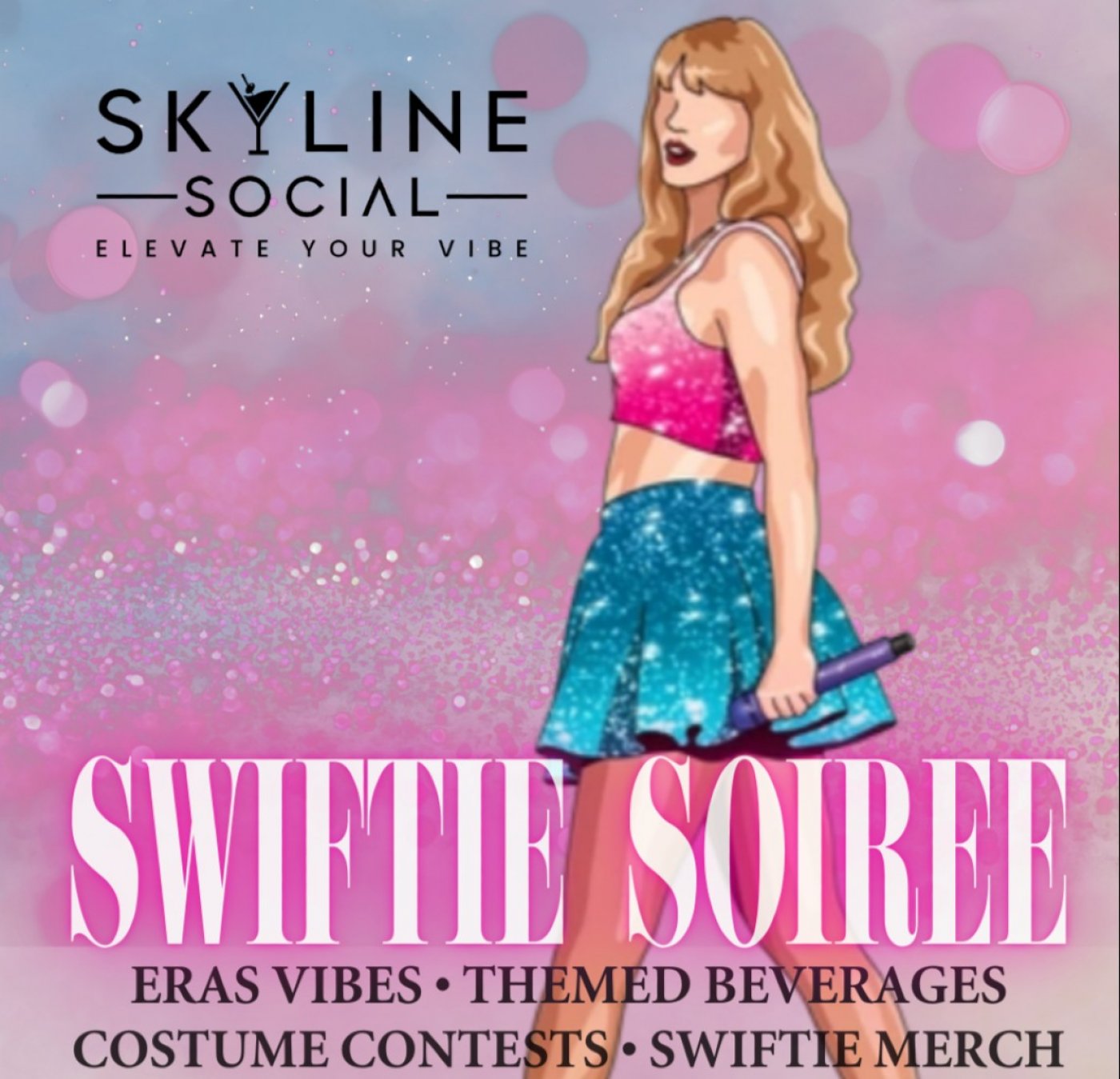 Get ready for a night made for Swiftie! Join us at Skyline Social for Swiftie Soiree, an Eras-inspired party filled with themed beverages, Taylor Swift music, costume contests, and exclusive Swiftie merch. Dress up, sing along, and celebrate all things Taylor in a fun, high-energy atmosphere.