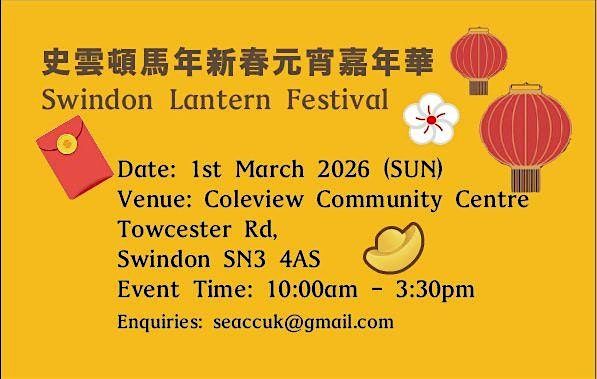 The Swindon Lunar New Year & Lantern Festival 2026 is a community led indoor cultural market organised by Swindon East Asia Culture Centre, celebrating Lunar New Year and Lantern Festival traditions of East Asia.