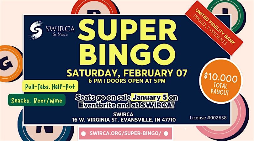 For more information, please visit http://swirca.org/super-bingo/, our Facebook Page at https://www.facebook.com/SwircaAndMore, email at [email protected], or call us at 812-464-7800.