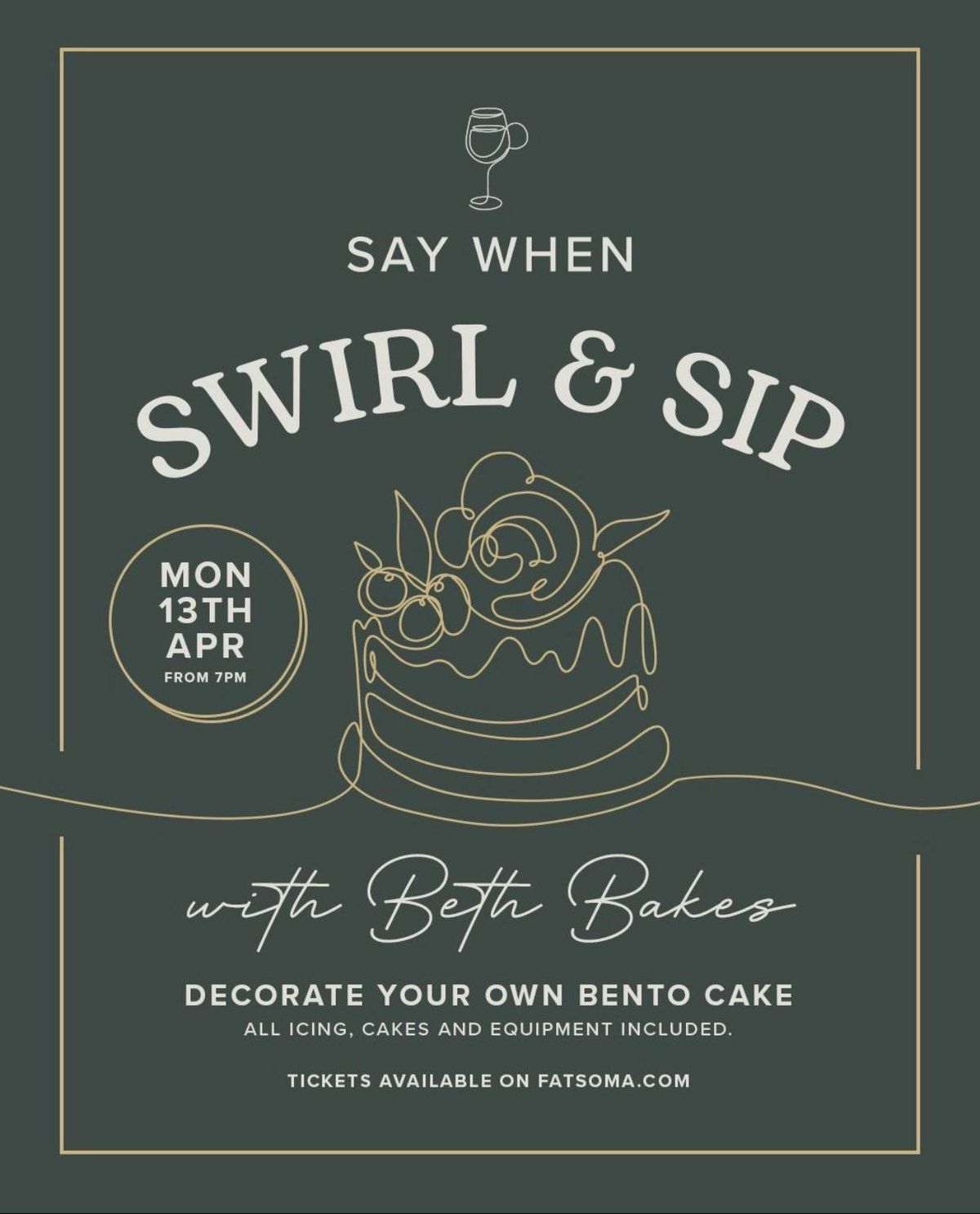 Join us for an evening of fun, creativity, and sweet treats at Sip & Swirl, a special event hosted by Beth Bakes at Say When.Monday 13th April at 7pm!
