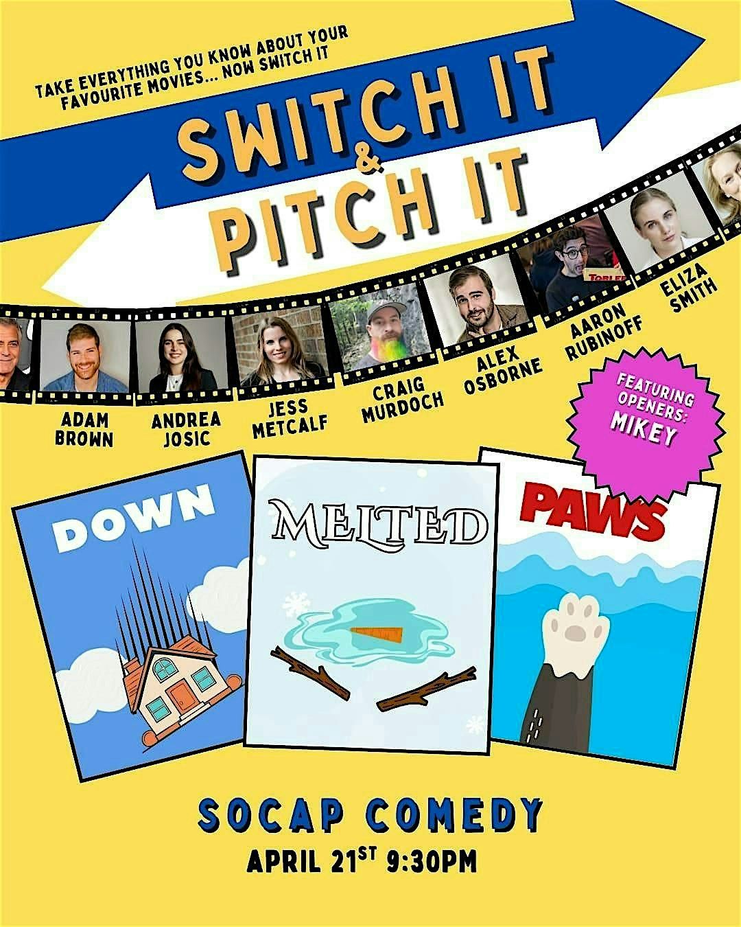 Welcome to Switch it and Pitch It, Toronto’s hot new improv show where we take your favourite movie and switch the title to the opposite meaning. Then we’ll pitch that new movie to a pair of hotshot producers and perform that new movie on the spot! Bring your popcorn and enjoy some of Toronto’s top improvisers perform unscripted hilarity.