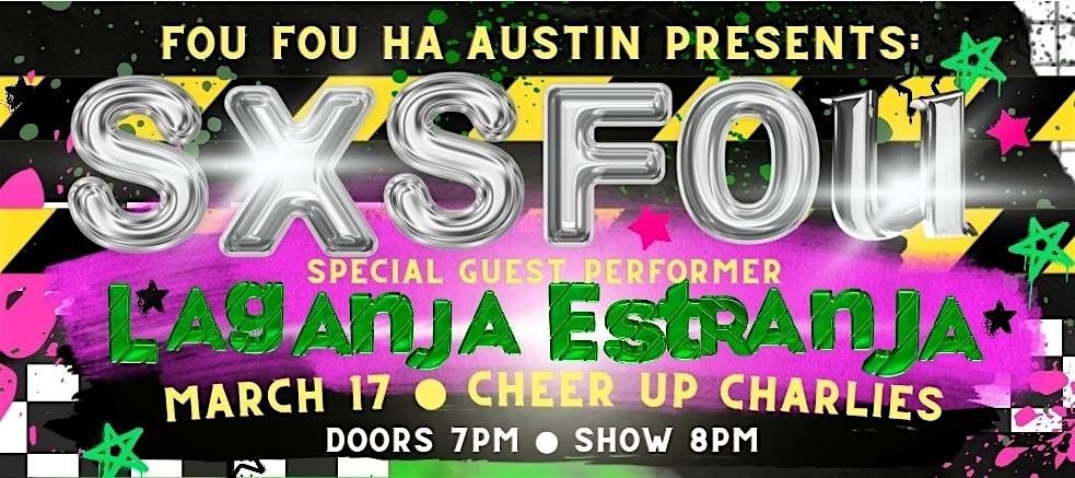 SXSFOU is a one-night clown cabaret rupture from the cast of Fou Fou Ha! Austin! Austin’s psychedelic fever dream of burlesque, performance art, spectacle, and high-glam absurdity. Expect strange stage acts, beautiful chaos, cartoon logic, and moments that feel like stumbling onto a lost public access broadcast from another dimension.