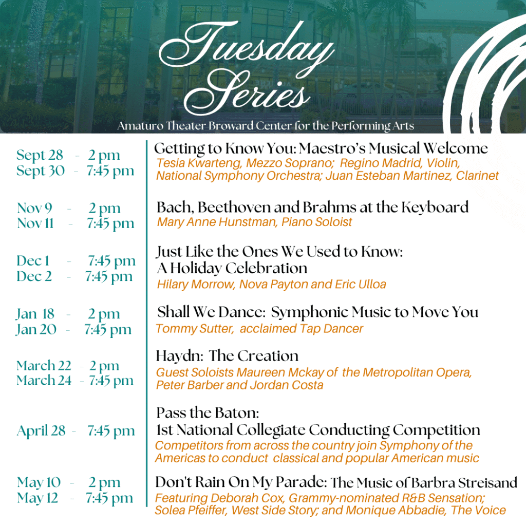 🎉 Welcome to Symphony of the Americas - Dont Rain on my Parade at Broward Center Amaturo, where dreams come alive and possibilities are endless! 🏛️ Join us at Broward Center Amaturo in the heart of Fort Lauderdale, FL for an event that defies expectations. 📅 On May 10th, 2026 at 02:00 PM, be part of something truly extraordinary as we bring together innovation, entertainment, and pure magic. ✨ Every aspect has been carefully designed to ensure an unforgettable experience for all our guests. Whether you're seeking adventure, inspiration, or simply a break from the ordinary, this event promises to deliver beyond your wildest dreams. 🎊 Prepare for a journey into the extraordinary!