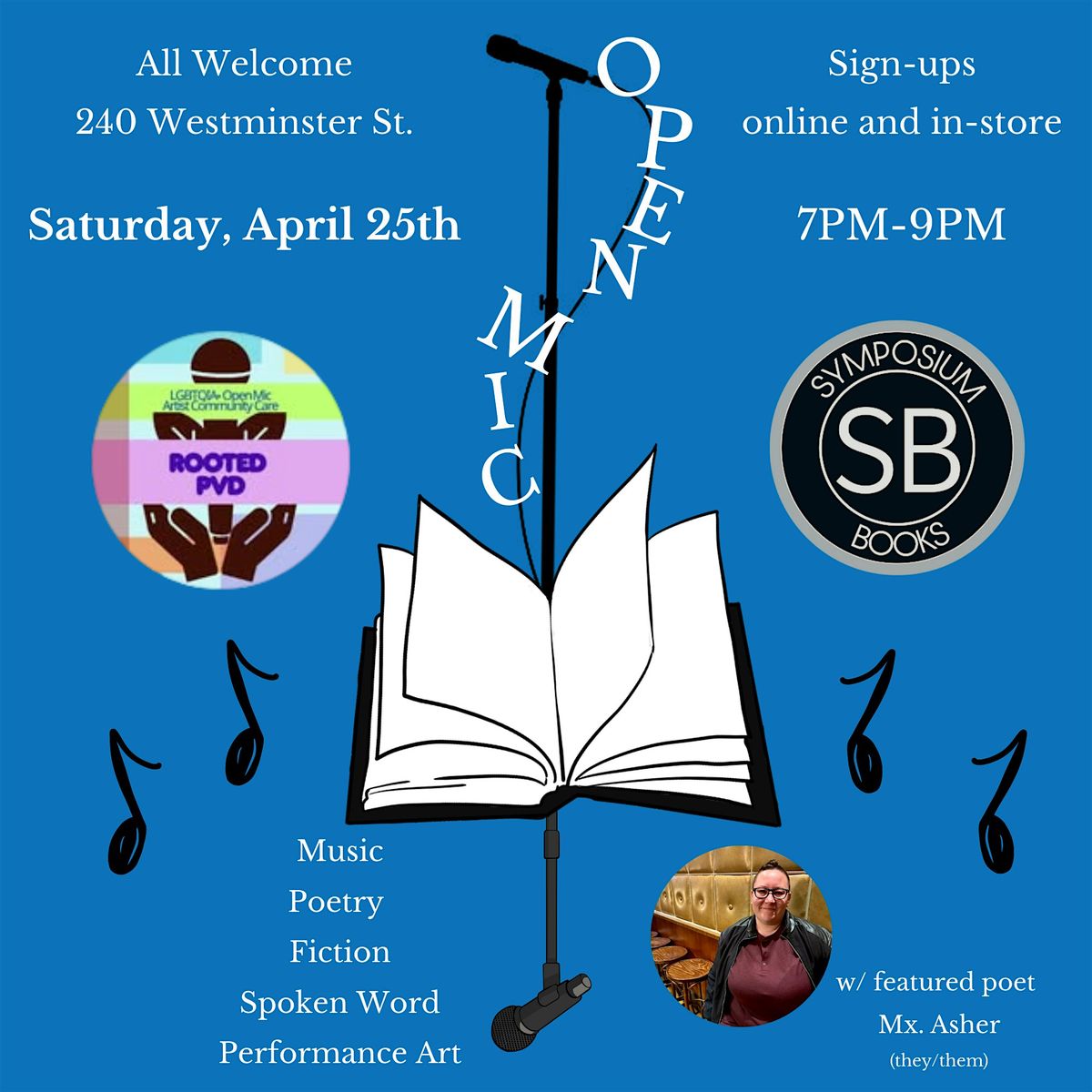 We're ending Independent Bookstore Day the right way with a community oriented open mic night in partnership with RootedPVD. Join us on April 25th from 7-9pm in-store as we host a lineup of local performers along with our feature poet, Providence's Mx. Asher!