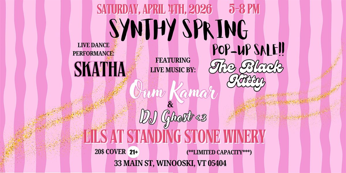 Welcome to Synthy Spring! πΈ Join us for a night of music, wine, and good vibes at Lil's at Standing Stone Wines. Get ready to dance and enjoy the sounds of spring on April 4th, 2026 at 5:00 PM (Eastern Time). Performers include Oum Kamar, Skatha, DJ Ghost <3, plus a pop-up sale with the Black Kitty boutique!